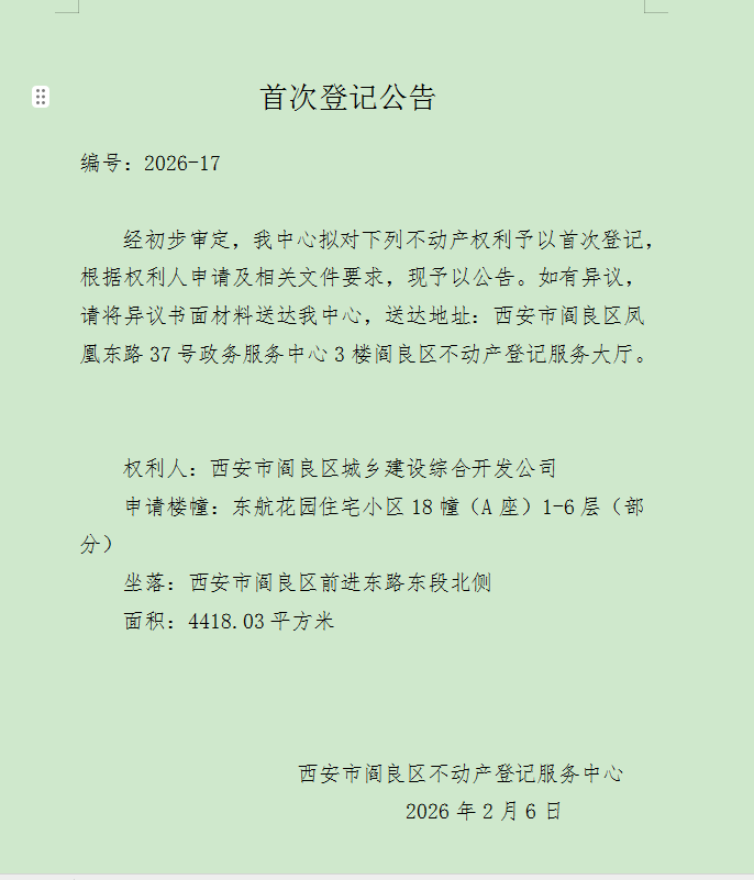 首次登记公告 编号:2026-17