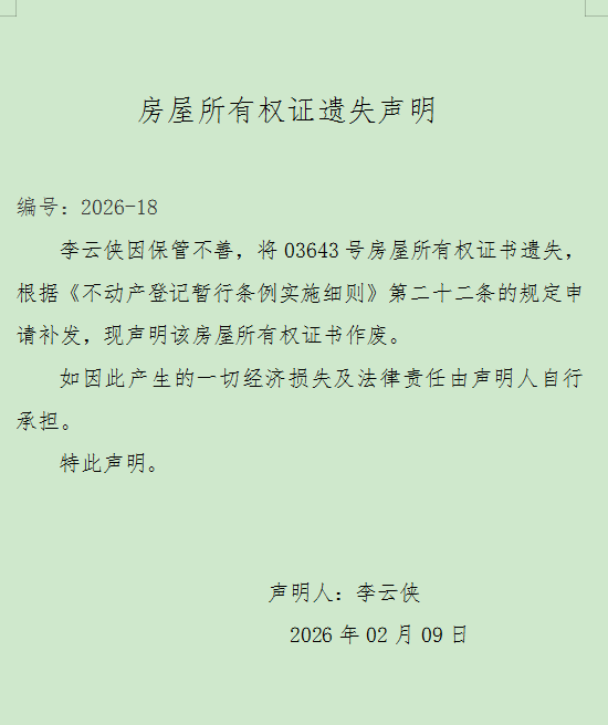 房屋所有权证遗失声明 编号:2026-18