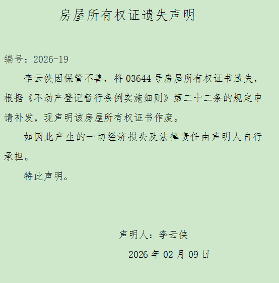 房屋所有权证遗失声明 编号:2026-19