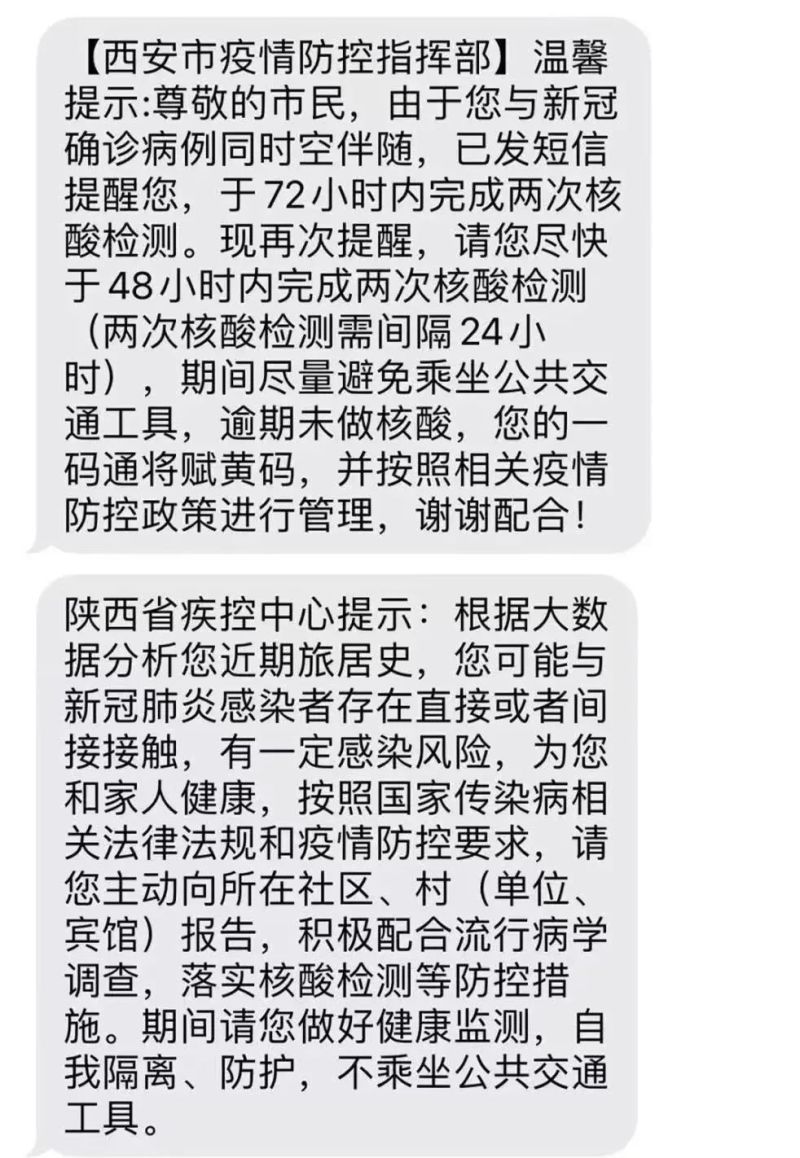 近期,有不少市民先后收到西安市疫情防控指挥部的提示短信,被告知与新冠确诊病例同时空伴随,要求在收到短信之日起,72小时内完成两次核酸检测,期间避免乘坐公共交通工具。逾期未做核酸,一码通将赋黄码,并按照相关疫情防控政策进行管理。