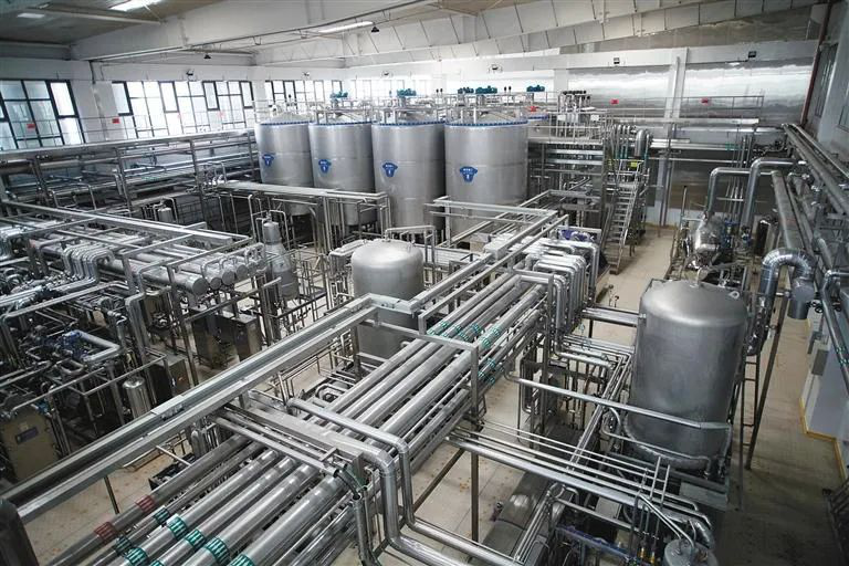图为在前处理车间,密布的回字形管道,呈现出一幅钢铁森林的画面。经过此系统和其他流程的配合,鲜奶变成固态奶粉。