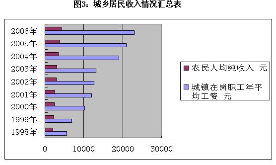 经济增长使全区人民生活水平逐年上升,城乡居民收入水平普遍提高,城镇在岗职工年平均工资从1998年的5614元增加到2006年的23000元,农民人均纯收入从1998年的2058元增加到2005年的4225元(见表3、图3)。城区居民的消费结构也发生了明显变化,从单一的温饱型消费方式逐步向时尚型、享受型、休闲型等消费方式转变。