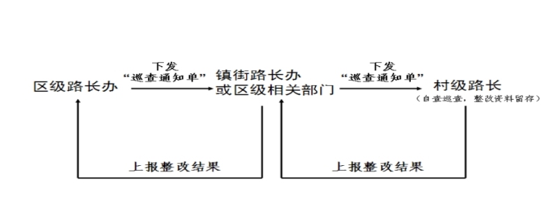 建立完善日常巡查制度,区级路长每月巡查管辖路段不少于1次,街办路长每周巡查管辖路段不少于1次,村级路长每周巡查管辖路段不少于2次。各级路长根据日常巡查情况,将巡查发现的问题以“巡查通知单”的形式反馈至下一级路长办或相关单位,由其整改并上报整改结果,实现“发现、整改、反馈”闭环管理。