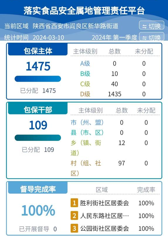 阎良区新华路街道在2023年四个季度食品安全“两个责任”工作落实上始终排名领先,对1500家左右的包保主体进行逐一检查,对注销、闭店和长期不营业的包保主体进行登记上报,对包保主体进行动态化管理。现阶段,2024年第一季度我办109名包保干部对1475家包保主体共同围绕“三清单一承诺”落实食品安全“两个责任”,压实CD级包保干部责任,做到包保对象底数清、情况明。按照《任务清单》4大类22小项,以实地督导+电话督导的方式对包保主体第一季度开展督导,并认真填报督导情况,将督导记录实时上传“食安督”,对发现的食品安全卫生等问题及时督促包保主体处理并报行业主管部门复查,成效显著,督导整改率100%。