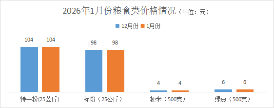 本月,当地主销品牌面粉特一粉价格104元/25公斤,环比持平;标准粉价格98元/25公斤,环比持平;粳米价格4.0元/500克,环比持平;绿豆价格6.0元/500克,环比持平。