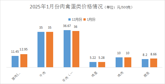 本月,猪肉(去骨后腿肉)价格每500克均价12.95元,环比涨幅13.1%;牛肉(去骨后腿肉)价格每500克均价35元,环比持平;羊肉(去骨后腿肉)价格每500克均价36元,环比降幅1.83%;新鲜完整鸡蛋价格每500克均价5.28元,环比涨幅1.05%;鸡肉价格每500克均价10元,环比持平;鲤鱼价格每500克均价8.66元,环比涨幅5.63%。