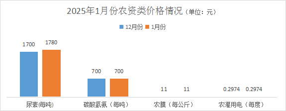 农资类价格略有浮动。其中尿素均价1780元/吨,环比涨幅4.71%;碳酸氢氨均价700元/吨,环比持平;农膜均价11元/公斤(国产幅宽4米),环比持平;农灌用电价格每度0.2974元,环比持平。