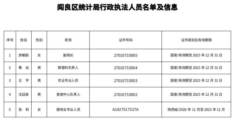 阎良区统计局行政执法人员名单及信息