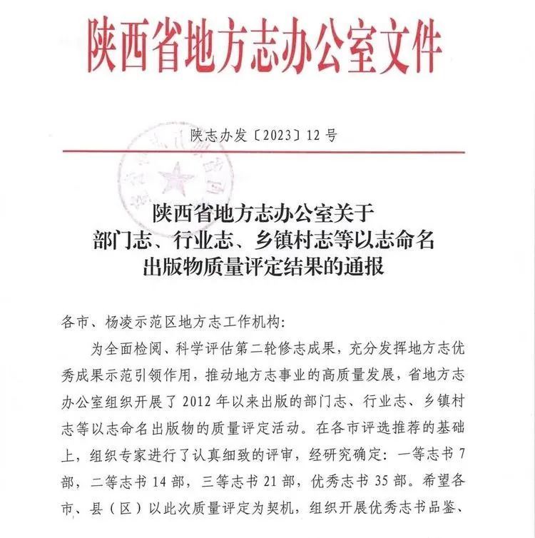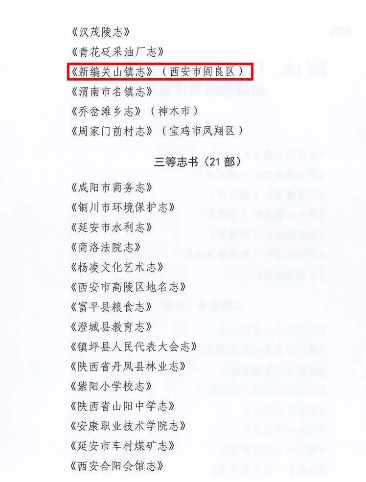 由阎良区档案馆编写的 《新编关山镇志》在陕西省地方志办举办的“2012年以来出版的部门志、行业志、乡镇村志等以志命名出版物的质量评定活动”中荣获二等志书。