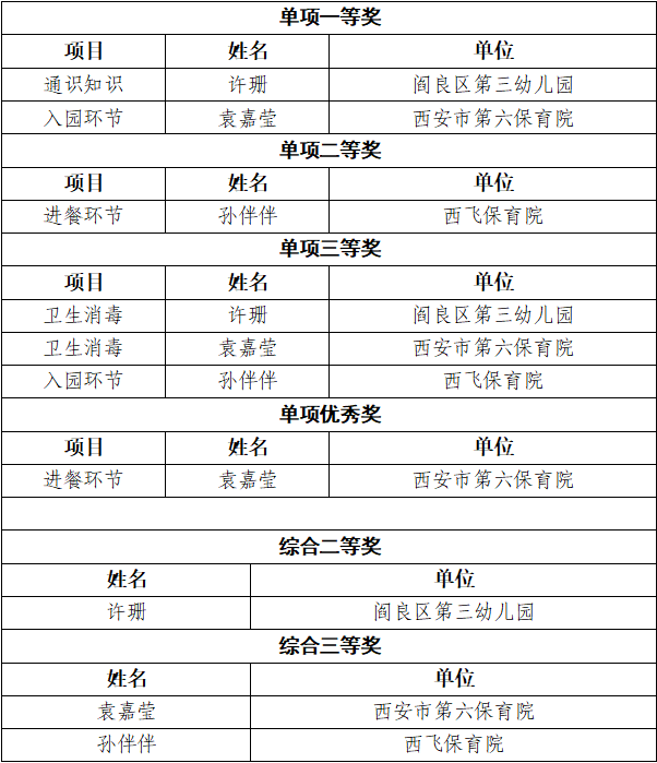 根据省教育厅办公室公布的第三届幼儿园保育专业技能大赛获奖结果,阎良区教育局遴选推荐的3名参赛选手全部获奖,其中单项一等奖2人次、二等奖1人次、三等奖3人次、优秀奖1人次;综合二等奖1人、三等奖2人。