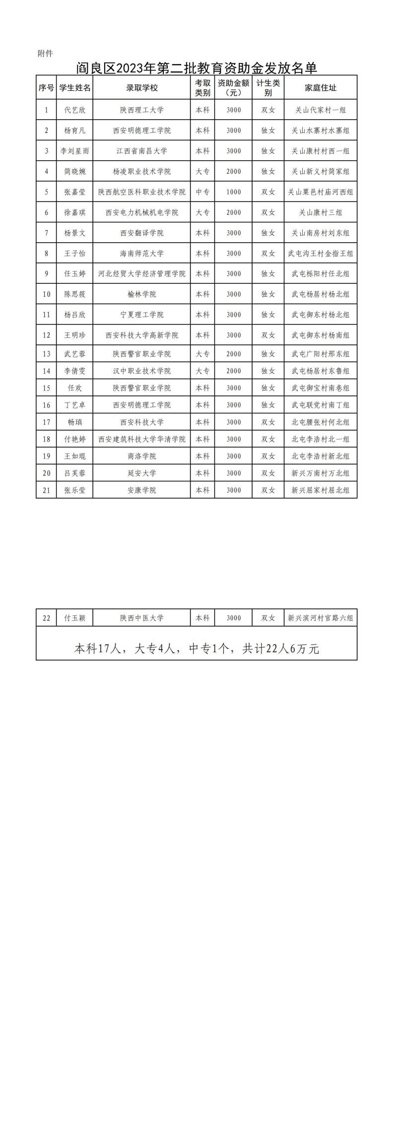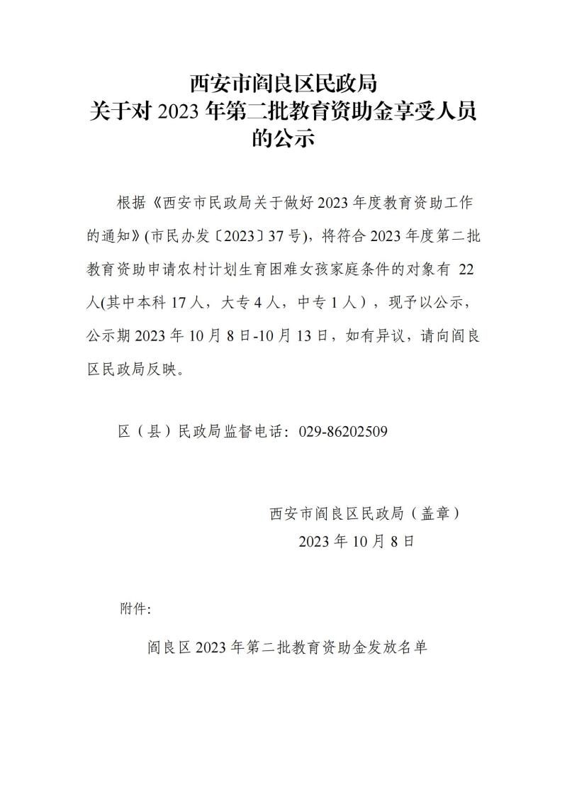 西安市阎良区民政局关于对2023年第二批教育资助(农村计划生育困难女孩家庭)享受人员的公示