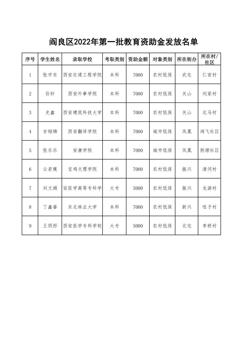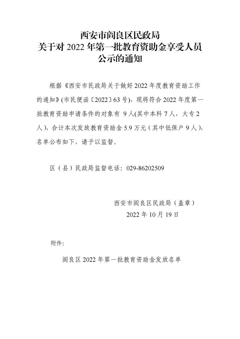 阎良区民政局关于对2022年第一批教育资助金享受人员公示的通知