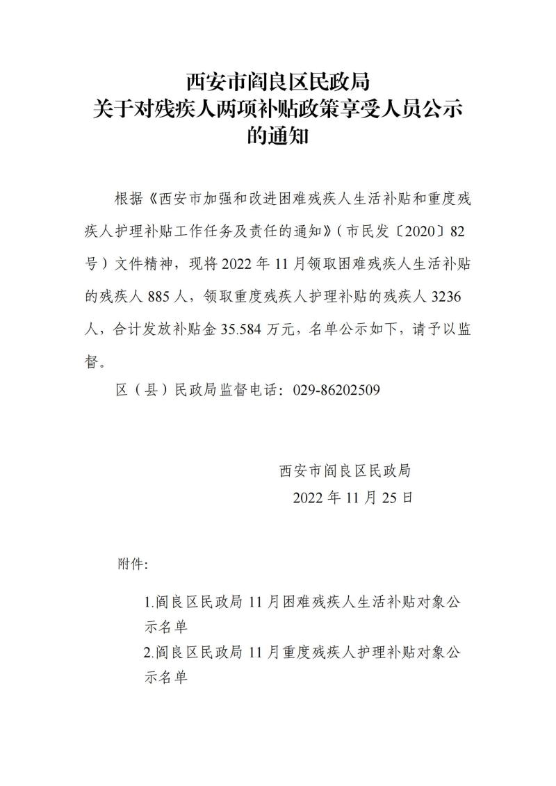 阎良区民政局关于2022年11月份享受残疾人两项补贴人员公示名单的通知