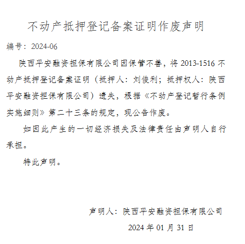 不动产抵押登记备案证明作废声明 编号:2024-06