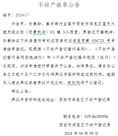 不动产继承公告编号:2024-17
