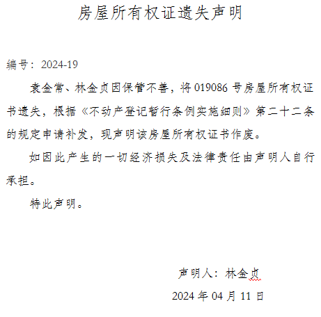 房屋所有权证遗失声明编号:2024-19