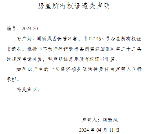 房屋所有权证遗失声明编号:2024-20