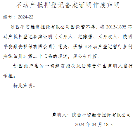 不动产抵押登记备案证明作废声明 编号:2024-22
