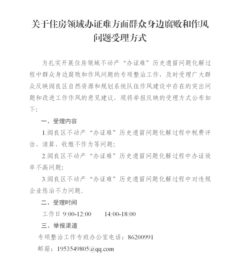 关于住房领域办证难方面群众身边腐败和作风问题受理方式