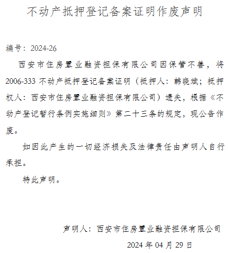 不动产抵押登记备案证明作废声明 编号:2024-26