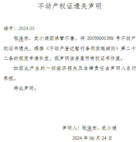 不动产权证遗失声明编号:2024-55