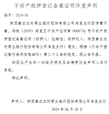 不动产抵押登记备案证明作废声明 编号:2024-58