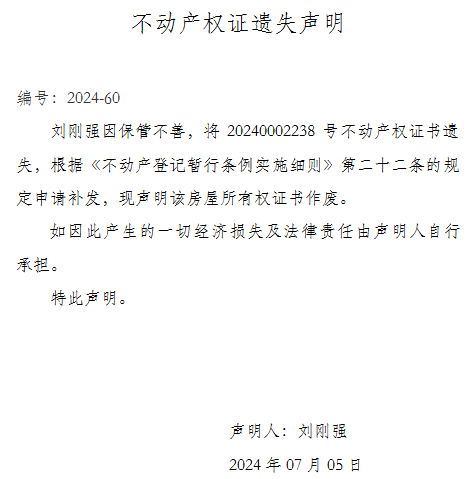 不动产权证遗失声明编号:2024-60