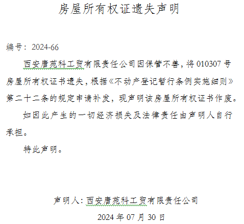 房屋所有权证遗失,特此声明。声明编号为202466,旨在告知相关方面该证件遗失的情况。