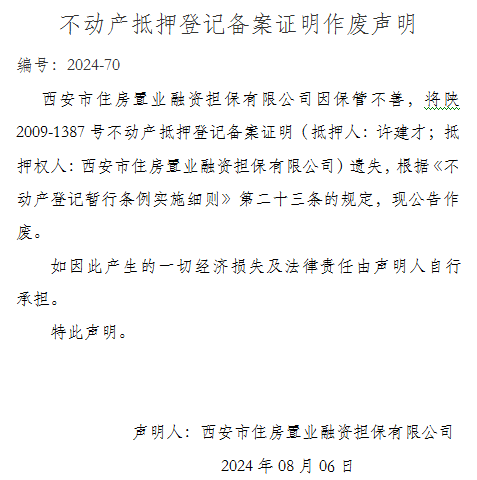 不动产抵押登记备案证明作废声明 编号:2024-70