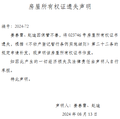 声明编号为202472的房屋所有权证遗失,提醒相关方注意。
