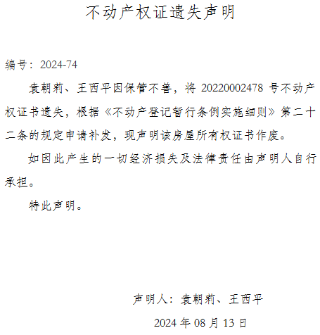 本遗失声明指出不动产权证编号为202474的证件遗失,声明人对该情况进行公示。