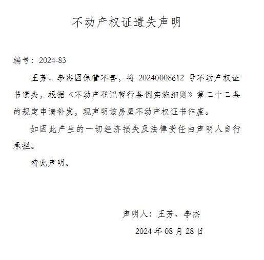 不动产权证遗失声明 编号:2024-83