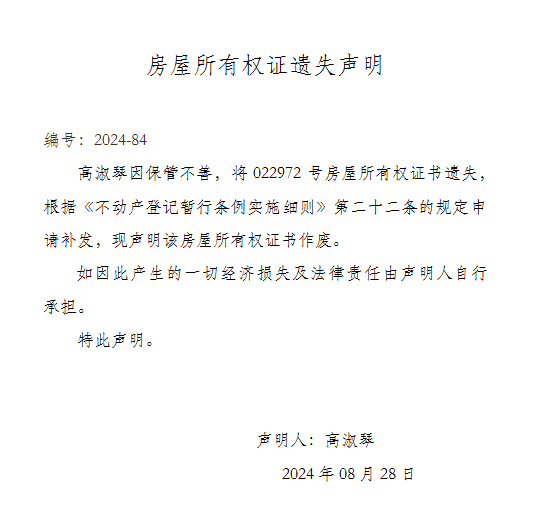 房屋所有权证遗失声明 编号:2024-84