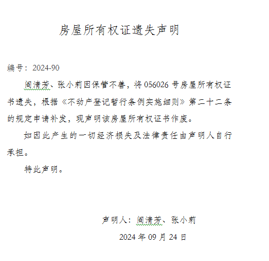 房屋所有权证遗失声明 编号:2024-90