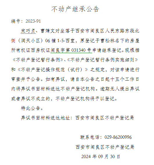 本公告就不动产继承事宜进行公示,公布了相关不动产的坐落、面积等信息,并说明对该继承事项有异议者可在规定时间内提出,公告时间为15个工作日。