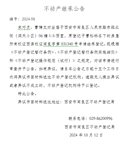 不动产继承公告 编号:2024-98