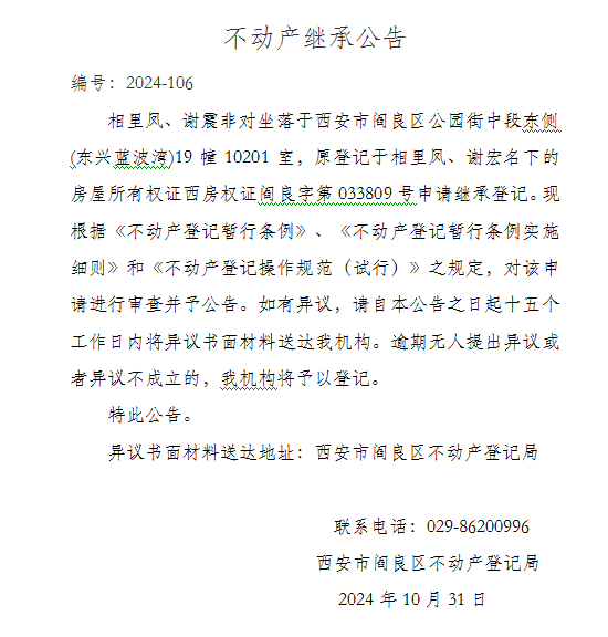 不动产继承公告 编号:2024-106