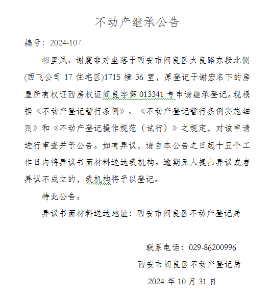 不动产继承公告 编号:2024-107