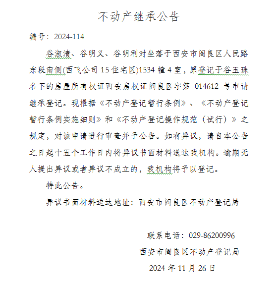 不动产继承公告,编号为2024114。