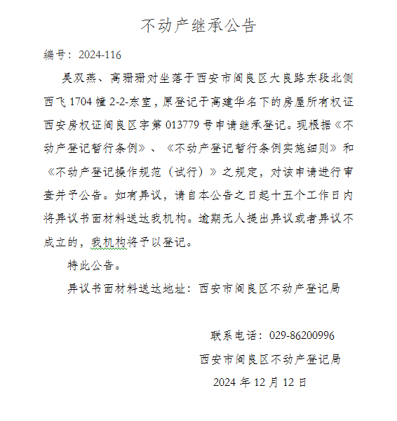 不动产继承公告 编号:2024-116