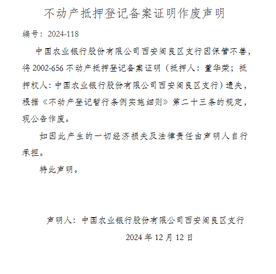 不动产抵押登记备案证明作废声明 编号:2024-118