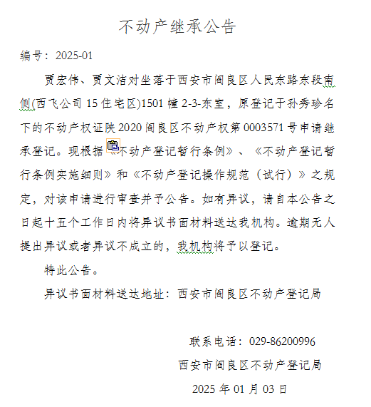 不动产继承公告 编号:2025-01