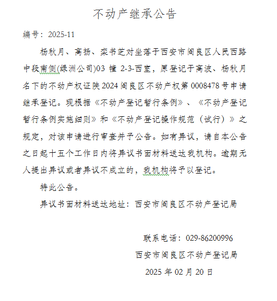 不动产继承公告(编号:2025 - 11)