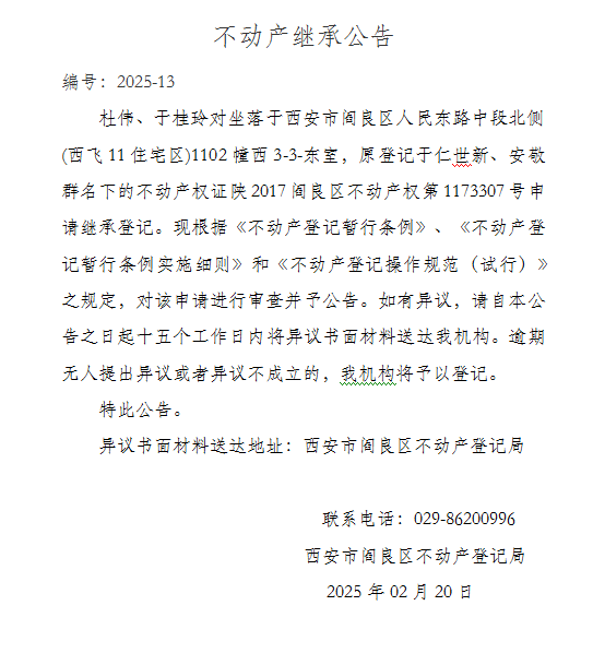 不动产继承公告 编号:2025-13