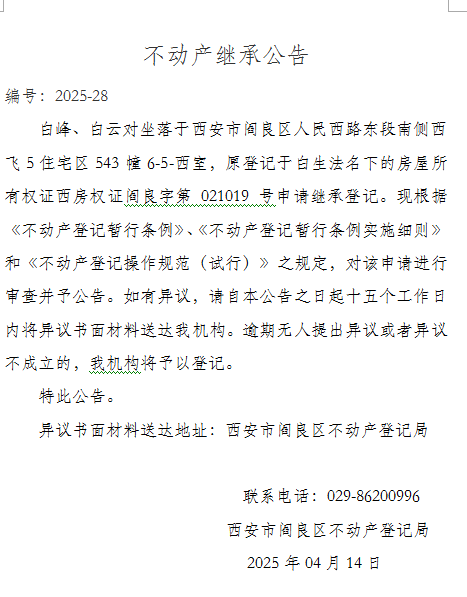 不动产继承公告(编号:2025 - 28)