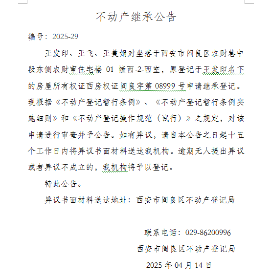 不动产继承公告(编号:2025 - 29)