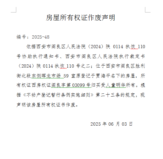 房屋所有权证作废声明 编号:2025-48