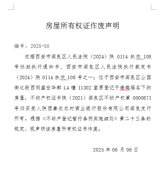 房屋所有权证作废声明 编号:2025-50