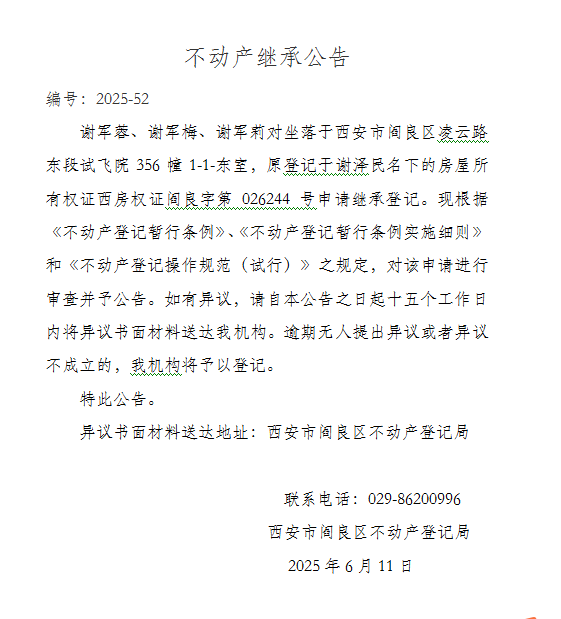不动产继承公告 编号:2025-52