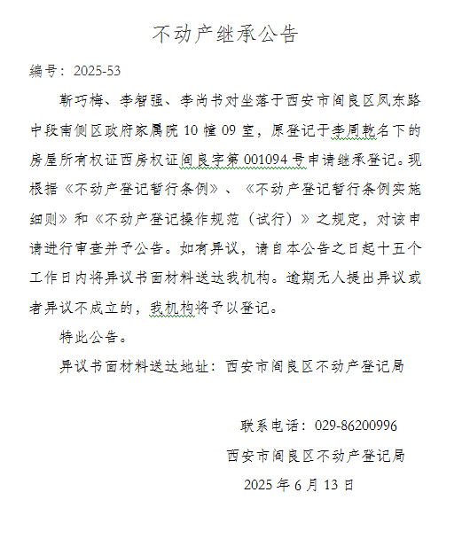 不动产继承公告 编号:2025-53